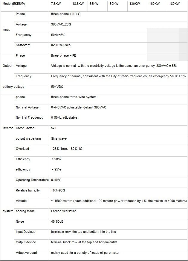 The EKES/P series power type emergency power supply is a three-phase input and three-phase output EPS emergency power and its power is 7.5KW-180KW, which is suitable to be used for such pure motor loads as the fire pumps, fans and spray pumps.