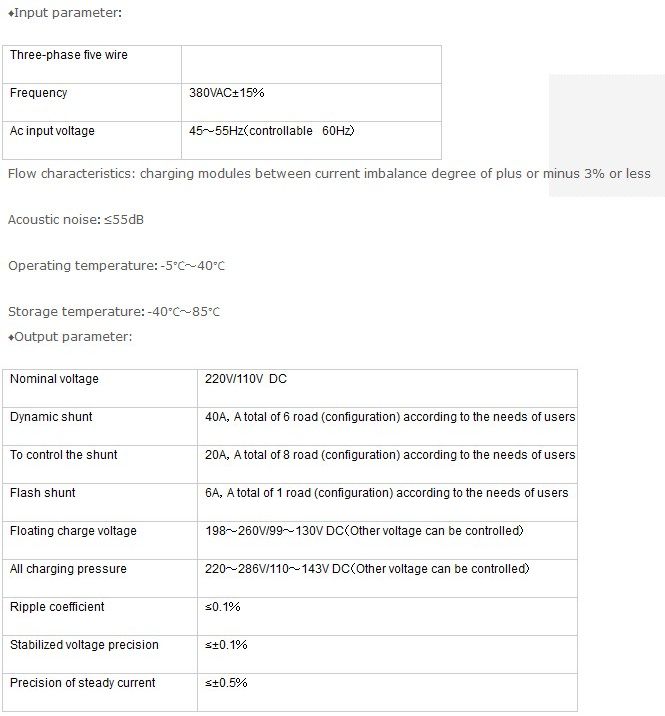 Charging standard integration system consists of two to eight modules, a monitoring module, a power distribution monitoring unit (optional), an insulation monitoring relay (or an insulation monitor), an ac power distribution cabinet and a dc feeder units. Apply to 31, 32, 35 wiring schemes, suitable for substation 110 kv and below, the user to change.