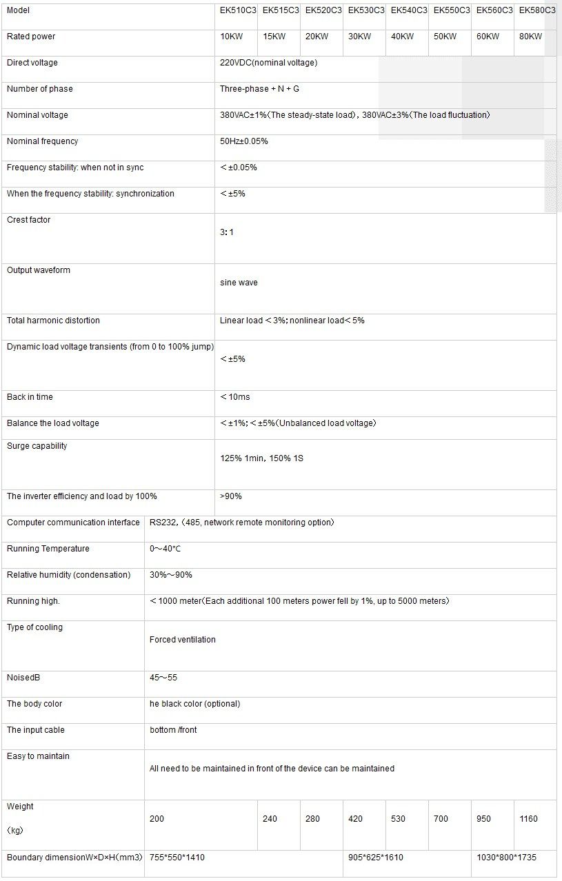 The EK500C3 (DC220V) series fully-digital inverter is the latest generation of the power supply product produced in Eksi company and is a highly intelligent product in integration of digitization, informationization and networking and provided with a strong information collection system, a signal processing system, a detection systems and a perfect protection system, which is designed and manufactured aiming mainly at the characteristics and requirements of the power control systems, is applicable to the high quality and the high reliability control requirements of the power control systems for the power supply equipment to meet the needs of a variety of terminal devices in the power control systems, and is also suitable for the occasions requiring stable AC output voltage and is widely used in various electricity-use environments, such as the photovoltaic off-grid power systems. The personalized design, the friendly man-machine dialogue function and the touch screen LCD display are the latest power supply display modules developed in this company, in which the most popular and the most intuitive graphical operation interface is adopted and, as compared with the general LCD display module, there are no complicated steps in this touch screen display module, the users may press directly the analog buttons on the display to obtain the corresponding information, thus being easy to operate and understand. And, in the meantime, the touch screen display module is equipped itself with the real-time clock and memory, which are used to record 256 items of events and other information settings.